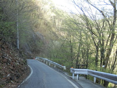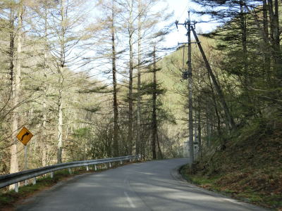 | 第10号カーブの手前は1.0車線幅と狭いが、崖側には崩落予備箇所がありカラーコーンが置かれていた。ただし、1年以上前からこの状態である。冬季閉鎖が解除されて月日が経過していないせいもあって路面状況は比較的良好である。第12号カーブはヘアピンカーブであり、直後の第13号カーブも少し進んだ所の第15号カーブもヘアピンカーブである。 | ||
