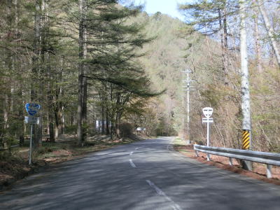 | 十石峠を越えた直後に林道との交差点を通過するが、その近くに大型車両の通行が不可能である旨の警告がなされている。その先に閉鎖用ゲートがあるが、群馬県側とは異なり単管パイプを組み合わせた簡素なものである。さらに進むと第1号カーブを曲がる。ここから麓まで多くのカーブを曲がらなければならないが、峠から下る際は最後の数字が分からないためどれくらい進んだかの参考にはならない。 | ||