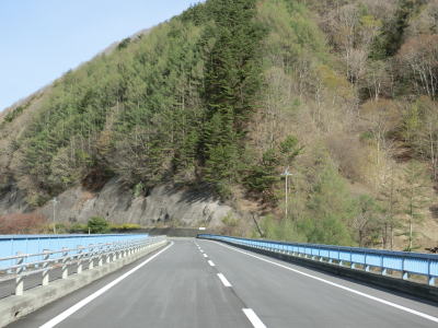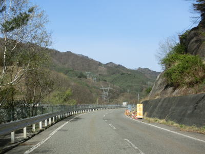 | センターラインが消える区間もあるが1.8車線幅程度は確保されており、交通量がほとんどない事もあって走りにくさはあまり感じない。センターライン付きの2車線道路になってしばらく走っていると臼石橋を渡り、以降は古谷ダムの北岸を走る。 | ||