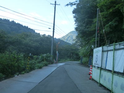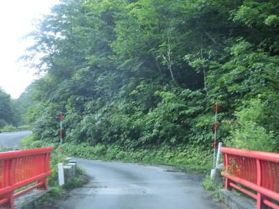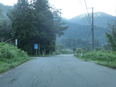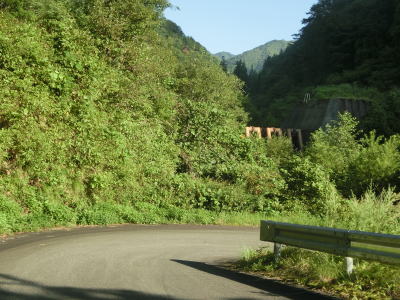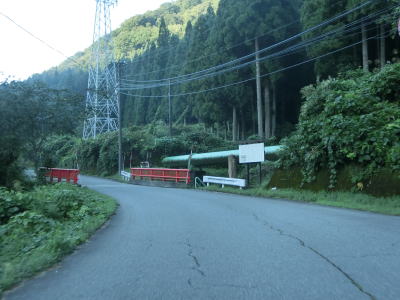 | 交通量の少ない1.0車線狭路を走っていると水上谷橋を渡り、その直後に大長谷第4発電所の出入口でもある猿越林道との交差点を通過する。発電所の真東で水圧管の上を通る。これより南はダムも発電所もなく完全に無人地帯となる。そのせいかどうかは不明だが、道路状況が劣化し落石や土砂の流出痕が見られるようになる。 | ||