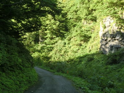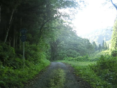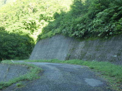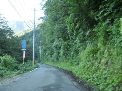 | 二ッ屋谷沿いとなってからも複数のヘアピンカーブを通過しながら1.0車線幅の狭路を走る。R471を走行したのは冬季閉鎖解除直後で草が刈られていなかったが、今回は草刈り後のため多少なりとも走りやすくなったと感じる。もっとも、走りやすくなったとは言えあくまで道路の両側に雑草が生い茂っていた時に比べたらの話であって、一般的な意味での走りやすくなったではない点に注意を要する。 | ||
