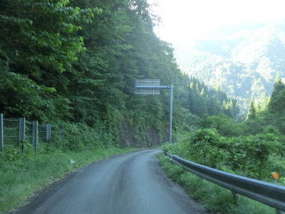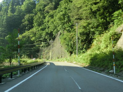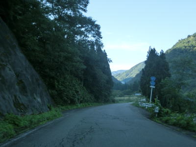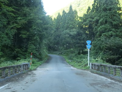 | 岐阜県に入ってからも1.0車線幅の狭路が続いている。道幅が狭いものの勾配はさほど急ではなく、切り立った断崖路ではなく比較的開けた谷筋を走る。県境からしばらくは狭いながらも路面の状態が良いが急に舗装状態が悪くなる。 | ||