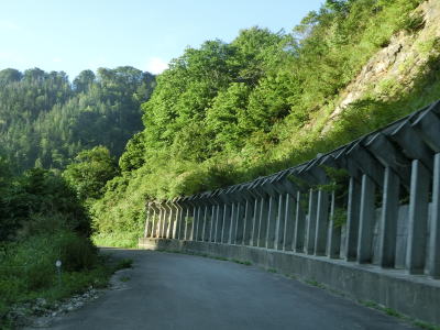 | R471栃折バイパスとの交差点を過ぎても山岳部という状況に変化はなく狭路が続いている。小刻みなカーブが連続している1.0〜1.5車線幅の狭路を走っていると左急カーブを曲がってロックシェッドをくぐる。ロックシェッド内と出てしばらくは2車線道路となっているが、おそらくロックシェッドや法面が整備された際に拡幅されたのだろう。法面が小崩落している場所は道幅が狭くなっているが、本来の道路だけでは車両を通せないのか路肩には鉄板を敷いて車線が確保されていた。 | ||