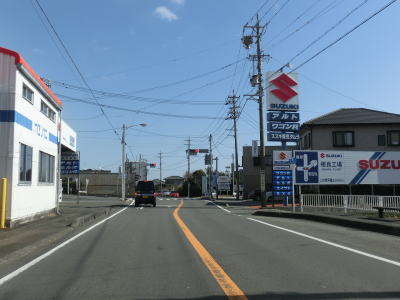 | 蛇行する萩間川の無視するかのようにR473は緩やかなカーブばかりの快走路で南下する。集落は途切れることなく続いているが、前述の通り相良バイパスが無料で通行できるせいもあって現道の交通量は少ない。但し、西萩間IC東交差点の少し南にスズキ自動車の相良工場の出入口があるため、工場が稼働している日は大型貨物車の通行が多い事も考えられる。 | ||