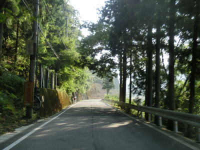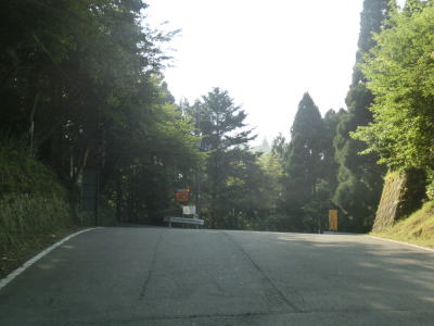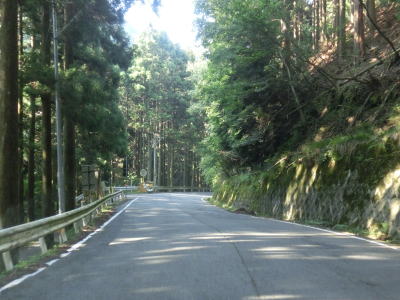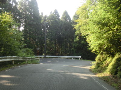 | 別所浄水場から約2.4kmで花脊峠を越える。峠からの眺望は全くないが道幅はやたら広くて乗用車同士どころか大型車両同士でも離合できそうなくらいある。峠を越えた直後は右にカーブしているが、左には杉ノ峠への林道(京都府警の無線中継局の保守用道路?)が接続している。 峠付近は広かったもののすぐに1.5〜2.0車線幅と若干狭い道幅になってしまう。勾配はややきつく、ヘアピンカーブを含む急カーブで標高を下げている感じである。ガードレールのない区間もあるが切り立った断崖ではないため転落の恐怖感は薄い。 |