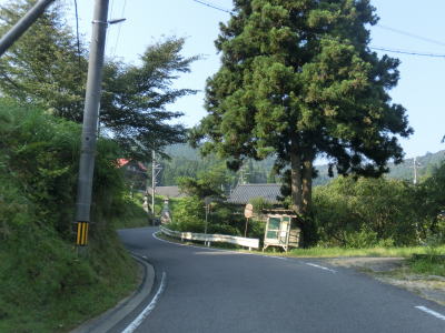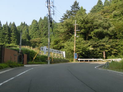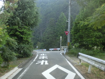 | 2.0車線幅に少し広くなった道路を走っていると別所浄水場の前を右にカーブする。浄水場の前には「花背峠トンネル化早期実現」という看板が立てられている。以前はもっと小さい一枚物の看板だったが、より大きく1文字1枚式になっていた。 浄水場からは集落が途切れてしまうが、道幅も勾配も集落内とほとんど変わらないが、急なカーブは増えている。左のヘアピンカーブには旧道別れというバス停があり、そこからコンクリート舗装の1.0車線幅道路が延びている。その狭路が旧花脊峠を越える旧道である。旧道との交差点からも上り勾配が続いており、急カーブが連続している。道幅は1.5車線以上は確保されており、見通しは良くないとは言え京都市右京区の狭路区間に比べると緊張した走りではない。 |