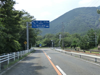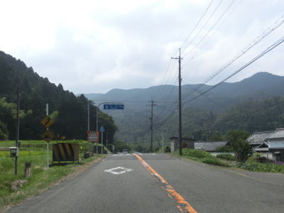 | 日野川に沿ってカーブとアップダウンを繰り返す2車線道路を走る。川に忠実に沿っているためやや急なカーブも存在しているが、2車線と比較的整備されているため余り気にならない。日野川に架かる小さな橋を渡ると日野町側最後の集落の平子集落を通り抜ける。 | ||