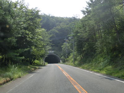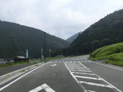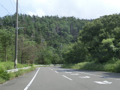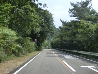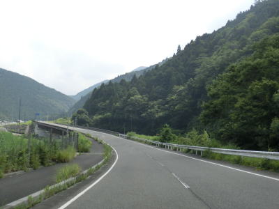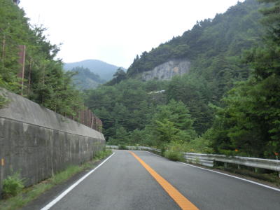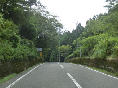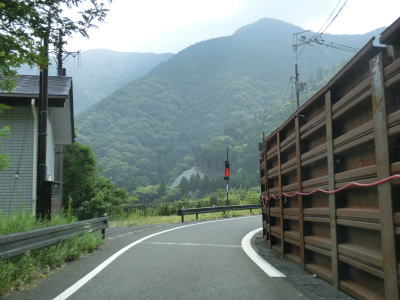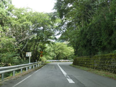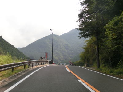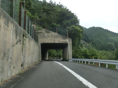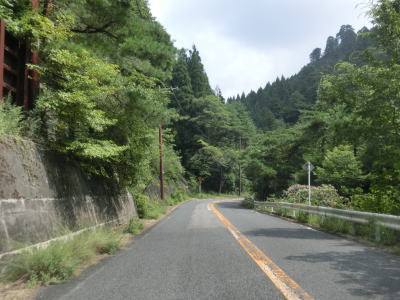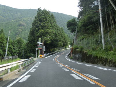 | ダム湖から通常の川になってからもほとんど勾配のない2車線道路を走る。深山橋を渡ると野洲川の右岸に移り、程なくして上り勾配が始まる。と言っても勾配は緩やかである。左の急カーブを曲がった先で猪足谷林道との交差点を通過するが、特に案内標識が設置されている訳ではないので気付かずに通り過ぎても不思議ではない。林道との交差点のすぐ先でロックシェッド2つを連続して通過する。 | ||
