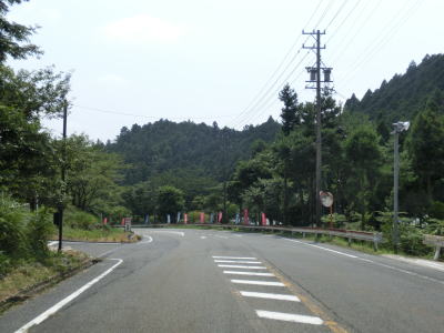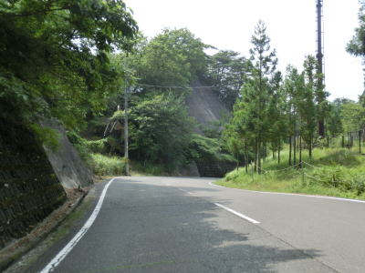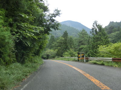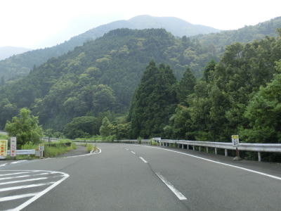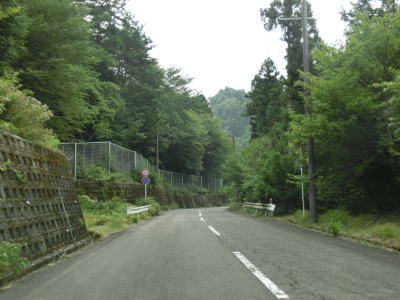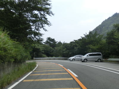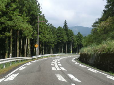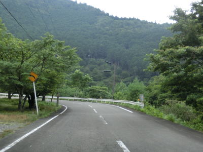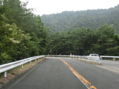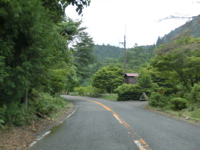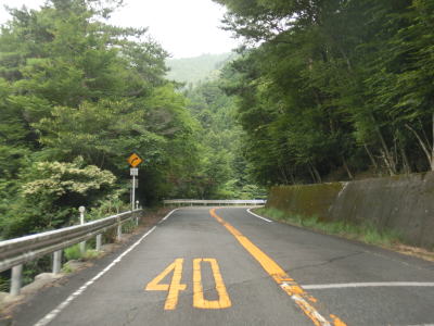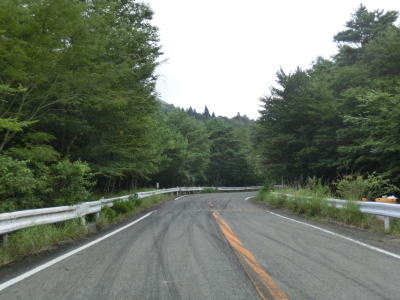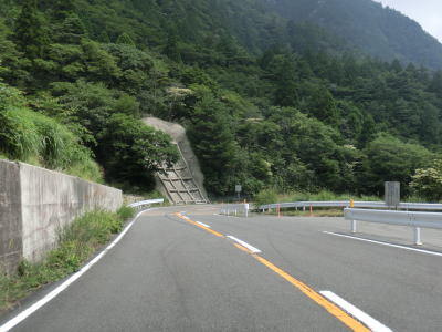 | 料金所跡を過ぎてからも野洲川の谷筋を走っており勾配は緩やかなものの小刻みなカーブが多い状況が続いている。野洲川から離れて支流の沢に沿って走り、右ヘアピンカーブを通過して左岸に移り、程なくして野洲川沿いに戻る。ヘアピンカーブには雨乞岳への登山道が分岐しており乗用車数台が停められるスペースがある。 野洲川を渡って右ヘアピンカーブを曲がると以降はヘアピンカーブが連続する区間を走る。勾配はさほど急ではなく2車線道路である事が災いしてか、路面には無数のタイヤ痕が付いている。この手の道路には段差減速帯やキャッツアイが設置されているケースが多いのだが、ここには普通のセンターラインしかない。 |