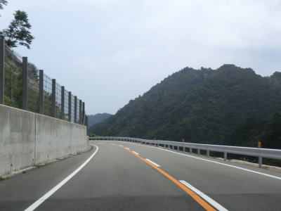 | 339.料金所跡以降は急カーブが多くなる | 340.正面に見えているガードレールはこれから通るR477 | 341.無数のタイヤ痕が残っている |