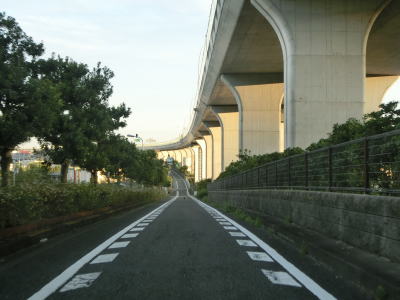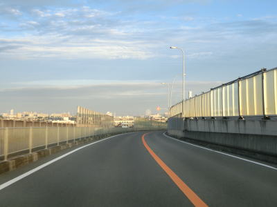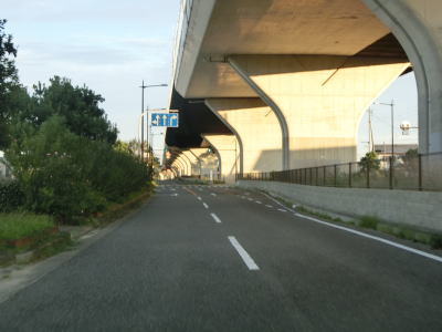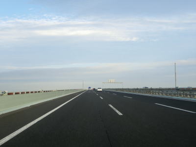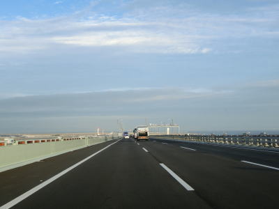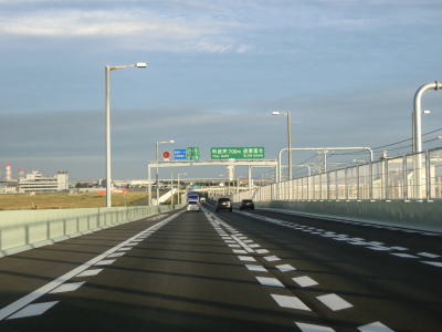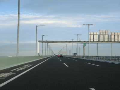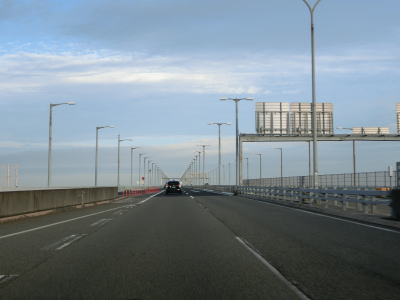 | E71関西空港道の本線に合流してすぐに阪神高速4号湾岸線からの側道も合流して片側3車線になる。鉄道も並走しているのだが、道路の下を通っているためその姿を見る事はできない。空港との連絡橋とあって航空機の離発着に考慮して橋の中央部分はポールタイプの照明ではなく欄干に埋め込まれた高欄タイプとなっている。そのため見通しは良いがコルトの目線の高さでは海はほとんど見えない。 | ||