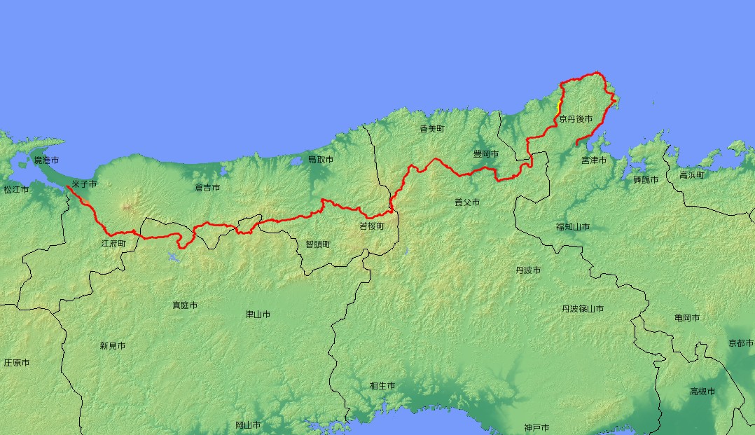 | 主な経由地 | 京都府宮津市〜京丹後市〜 〜兵庫県豊岡市〜香美町 〜鳥取県若桜町〜八頭町〜鳥取市 〜岡山県鏡野町〜 〜鳥取県三朝町〜 〜岡山県真庭市〜 〜鳥取県江府町〜米子市 |