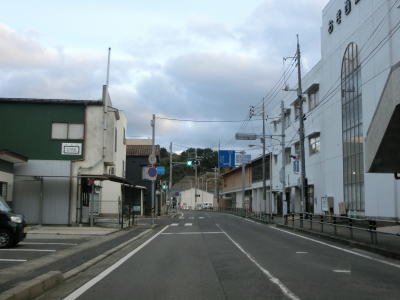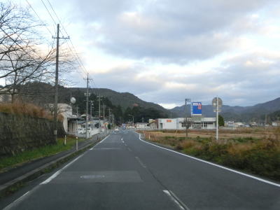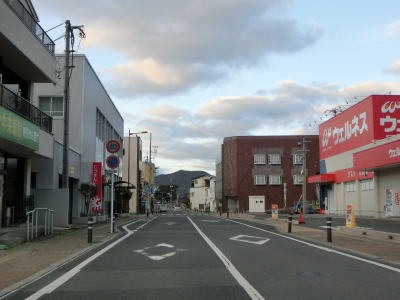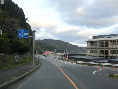 | 下り勾配が終わって平坦になる所で隠岐の島町の役場の前を通過する。新築移転されたのが2020年9月からなのでまだ新しい。町役場を過ぎて少し走るとS字状のカーブを通過するが、その辺りに島の商業施設が集中している。八尾川に架かる八郎橋の北詰で島根r323交差点を通過する。 | ||