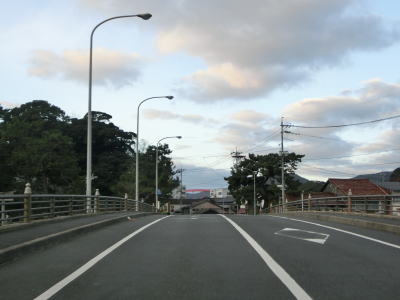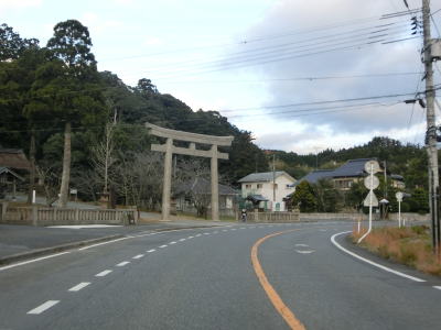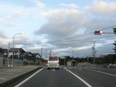 | 重栖川沿いになると勾配がなくなって平坦になる。水若酢神社の近くを通った後に郡川を渡って島根r44交差点を通過する。r44は路線名を西郷都万郡線といって、概ね隠岐の島の西側の海沿いを通っている。r44交差点からも走りやすい2車線道路が続いており、大きく左にカーブして進行方角を北に向ける。 | ||