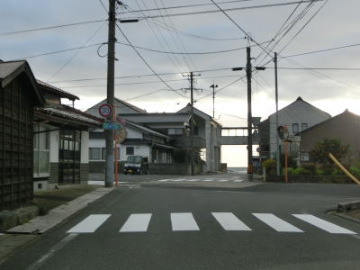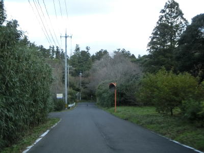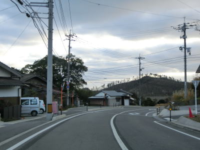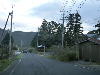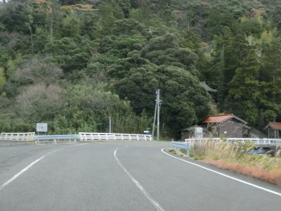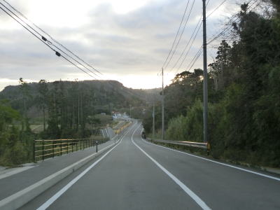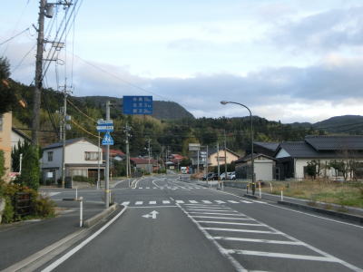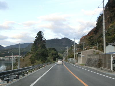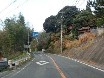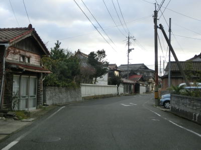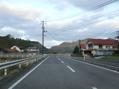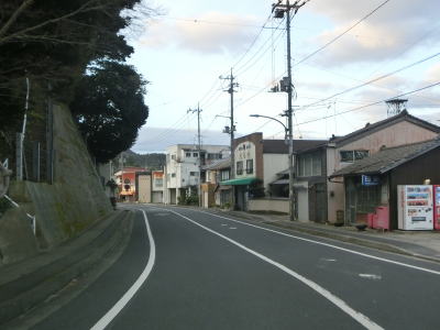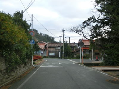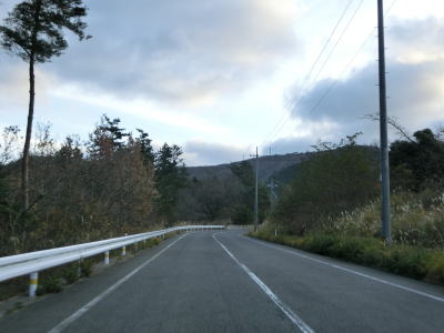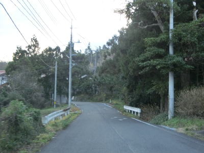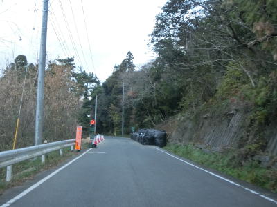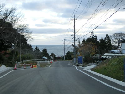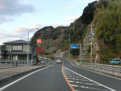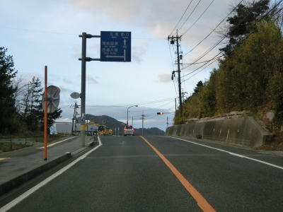 | 伊後集落を通り過ぎて2.0車線幅のカーブの多い道路を走っていると右カーブの先で白島崎に至る道路との交差点を通過する。隠岐の島の北端の岬で展望台や白島埼灯台がある。国道トレース終了後にフェリーまでの時間を利用して島内の観光スポットをいくつか回ったが、12月の平日とあって他の観光客と遭遇したのはこの白島崎のみであった。白島崎の根元を通りりすぎて少し走ると西村集落に差し掛かる。この集落内の道幅も狭いが拡幅工事が始まっていた。 | ||