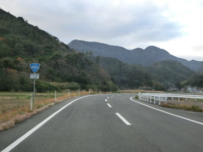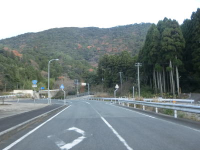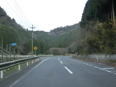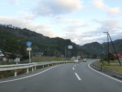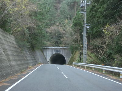 | 八尾川を何回か渡りながらその流域を上流に向かって走る。長い上りが続くものの勾配は非常に緩やかである。都万目集落に至る町道との交差点の先で日の津トンネルをくぐる。川沿いに旧道があったようだが廃道になっていると思われる。 | ||