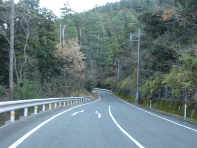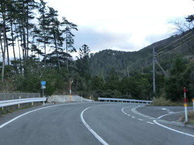 | 旧道との交差点を通過してからも急カーブが連続している。程なくしてセンターラインがなくなって道幅が狭くなる。狭いと言っても1.8〜2.0車線幅程度はあるので乗用車同士であれば比較的容易に離合可能である。 | ||