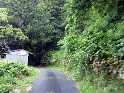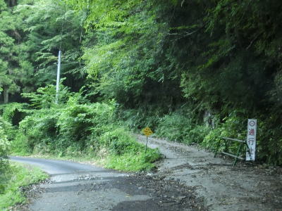 | 広島r293との交差点からは沿線の家屋が途切れるせいもあってさらに酷道度が高くなる。最後の家屋(廃屋)を通り過ぎると樹木に覆われた中を通っており、晴天であっても薄暗さを感じる。道幅は1.0車線と狭く離合箇所もほとんどなく、轍苔からも交通量が皆無である事が分かる。大畑郷ノ実林道との交差点はY字路となっているが、道なりに左方向へ進むだけなのでルートミスする可能性は低いだろう。林道は通行止のようだが仮設のゲートは開放されていた。 | ||