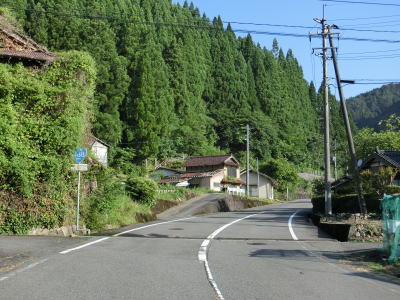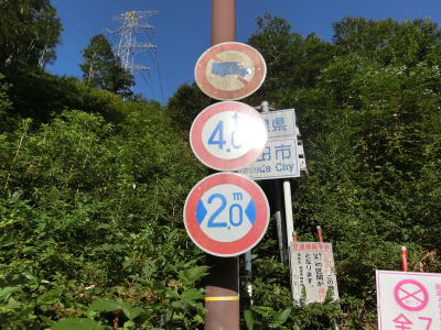 | 出合橋の東詰で小川林道との交差点を通過してからも道幅を始めとする道路状況に変化はない。18tの重量制限を示す規制標識が設置されているが、直近には重量制限が掛かりそうな橋といった構造物は見られない。そもそも車幅2.0m未満で重量が18tを超える車両は存在しないだろう。 | ||