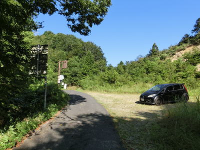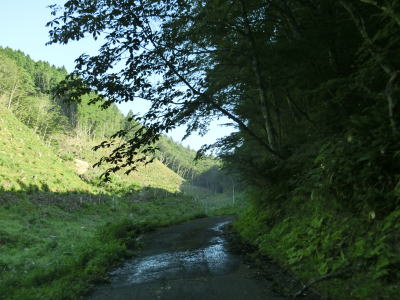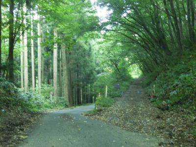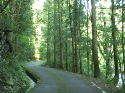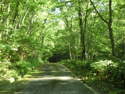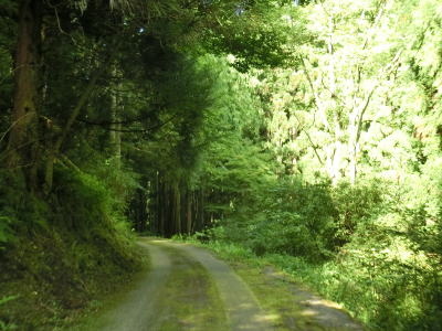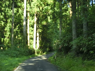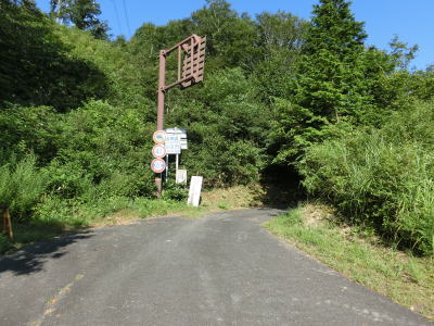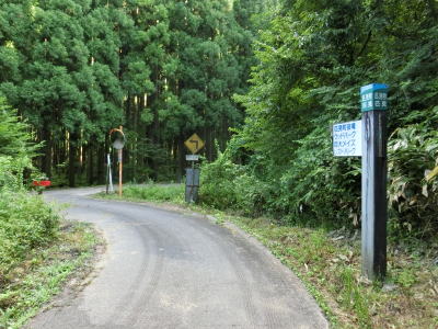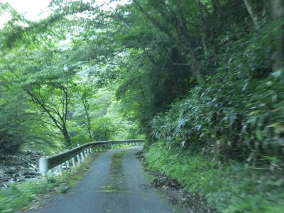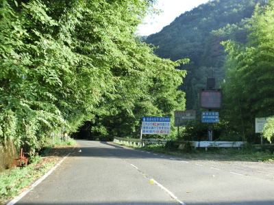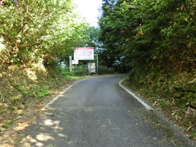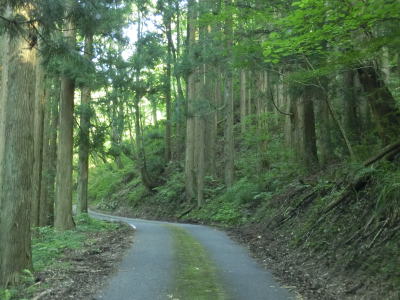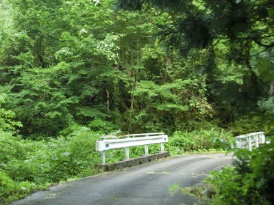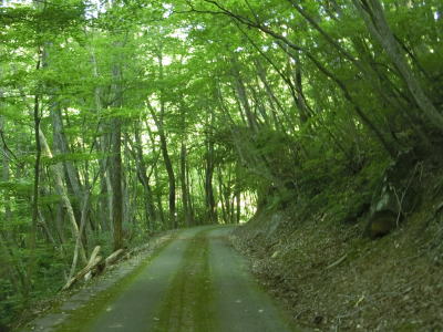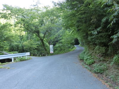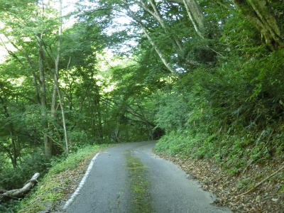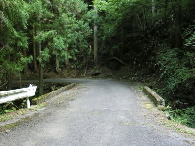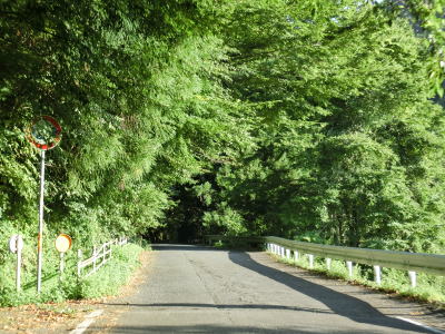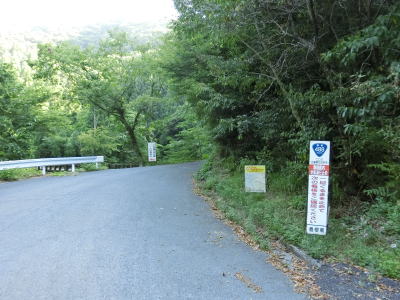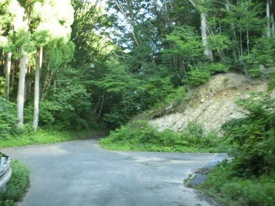 | 3つの林道との交差点を通過してからも道路状況に変化は見れない。林道(作業道?)が交差している右カーブを曲がると主川から離れて谷を上る。谷の反対側は大規模に伐採されており開けた状態になっているが、道路がある側は樹木が伸び放題である。 | ||