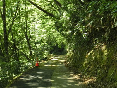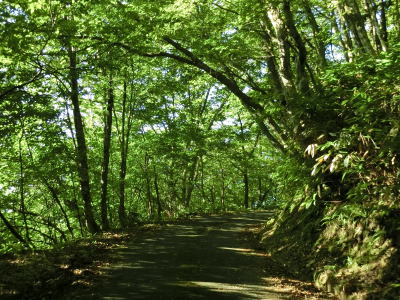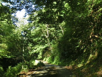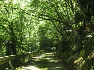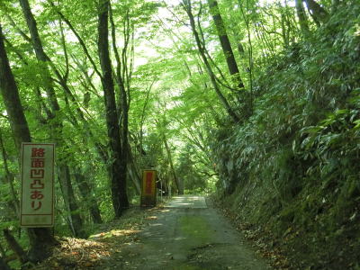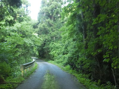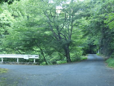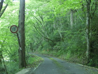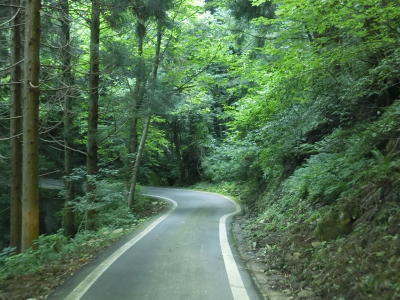 | 勾配は緩やかながら急なものを含めてカーブの多い1.0車線幅狭路を下って行く。三坂峠からしばらくは路面状況が安定しているが、標高800mを下回った辺りから路面の補修痕が目立つようになり凹凸も多くなる。 | ||