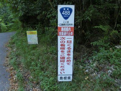 | R186・R434交差点を右折して単独区間に戻ると緩やかな上り勾配の2車線道路を走るが、僅か250m程でセンターラインがなくなり道幅も狭くなる。幅員減少地点には広島r293交差点と同様の標識群があり、左から順に幅2.0m超の車両が通行できず島根県内が通行止である旨、積雪時通行不能区間が11.0kmである旨、異常気象時通行規制区間も11.0kmである旨の標識が設置されている。電光掲示板にも県境より先が通行止であるという情報が表示されている。標識群を過ぎた直後には最大幅2.0mの規制標識が設置されており、これ以降は法的に幅2.0mを超える車両は通行できない。 | ||
