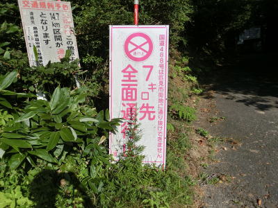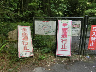 | 三坂八郎林道との交差点から約11.2km、三坂峠から約8.1km、広見ゲートから約1.1kmでせいこ橋通行止地点に到着する。なぜかそれぞれの場所にあった通行止地点までの距離が合っていない。ゲートはフェンスタイプが設置されており、両脇はコンクリートが置かれている。完全に進入できない仕様ではなく南京錠を外して開ければ進入できるようになっている。つまり一般車両は進入できないが、維持管理車両等は進入できるという事である。 全面通行止看板の間に迂回路を示す看板が取り付けられている。それによると迂回路は一旦R186まで戻って戸河内まで進んでR191、島根r307を通るルートが案内されている。迂回距離は92.7kmである。前述の三坂八郎林道を利用するルートであれば半分以下の38.2km程度で済むが、林道の通行可否が不明なので推奨ルートには挙がっていない。 |