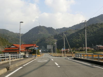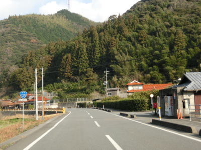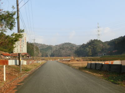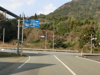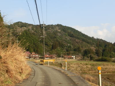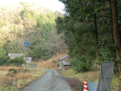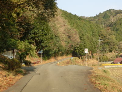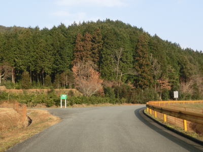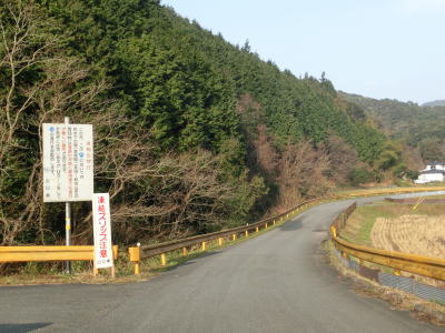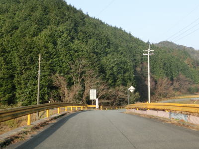 | 大田川の右岸に移ってからも1.8〜2.0車線幅の道路を走る。沿線の家屋は数えられる程度しかないが田畑が広がっている。美東大滝・小滝・鯨ヶ岳登山口に向かう道路との交差点をカーブしながら通過すると最終のお知らせ看板を通過する。この3本目の看板が集落と田畑が途切れる地点でもある。 | ||