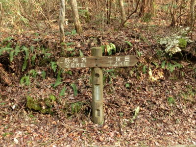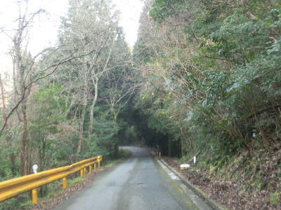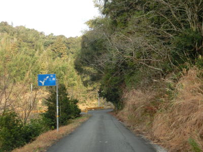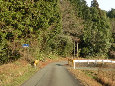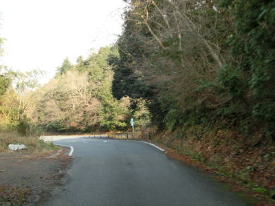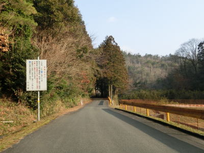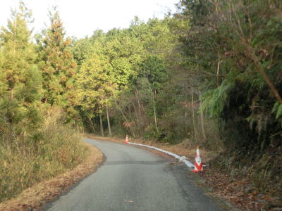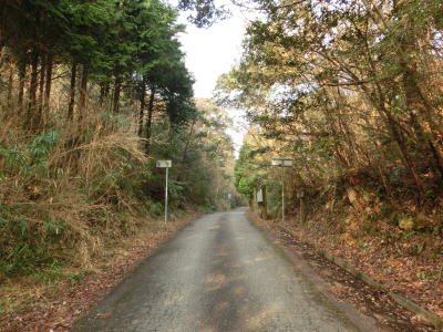| 最終お知らせ看板を通り過ぎると道幅は1.5車線と狭くなる。少し進むと右側に湿地が見えるが、ただの耕作放棄地ではなく二反田ため池という池でカキツバタ等の湿地植物群落である。ため池からはさらに狭く1.0車線幅になる。勾配は緩やかで、カーブも急なものはない。お知らせ看板の影響か、交通量は少ないようで路肩には落葉の時期でもないのに多くの落ち葉が堆積している。 | ||