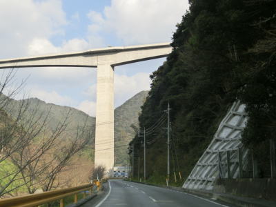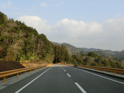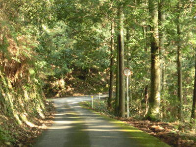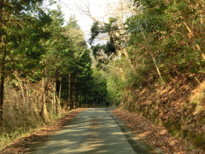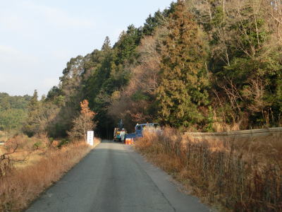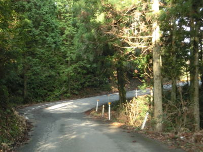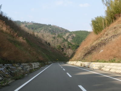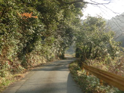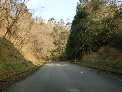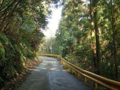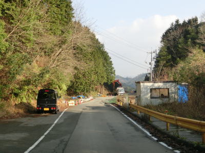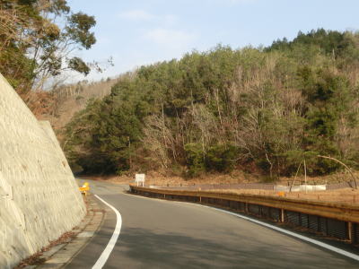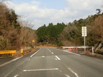 | 鬱蒼とした木々に覆われた1.0車線狭路を走る。交通量は少ないとは言え奥に集落があるため皆無とまでは言えない。この日も軽自動車とごみ収集車の2台とすれ違った。退避できるスペースは少なく、バックしての離合を余儀なくされた。 そんな狭路を走っていると工事現場に出くわす。拡幅のため山を削っているようで片側交互通行規制が敷かれているとの予告看板が立てられていたが、交通誘導員も信号機もなく規制も敷かれてないようだった。工事現場からはセンターライン付きの2車線道路になり、舗装がまだ新しいころから開通してさほど時間が経過していないと思われる。山の斜面を嵩上げして道路を造ったようで、山肌に沿った旧道が見える。 |