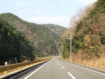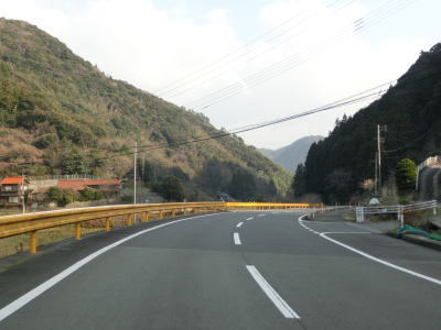 | センターライン付きの2車線道路になってから少し走ると旧道との交差点を通過する。前回走行時(2008年)はここで旧道に進まされたが、今回はバイパスが開通しておりそのまま道なりに2車線道路を走る事になる。なお、旧道は国道の指定を外れているものの沿線に集落と田畑があるため現在でも通行する事ができる。桑の木集落から山口r308にかけての区間と似たような道路状況と風景である。 山田バイパスは旧道が後藤ノ浴を通っていたのに対してひとつ西の杉山浴を通っており、山を越えなければならないが山が切り開かれており峠を通る訳ではない。杉山浴に沿ってやや急な勾配と緩やかなカーブの2車線道路を下っていく。 |