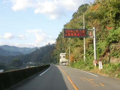 | 徳島r254交差点を過ぎると穴吹川沿いを走るようになる。電光掲示板にはR438の神山町内で山腹が崩壊したため通行止と表示されている。R438だけでなくR439やR492の山間部区間は災害による通行止が発生する事が多い。対岸のr254は1.0車線幅の狭路区間や分断区間が存在しているが、R492はセンターライン付きの2車線道路と決して酷い道路状況ではない。 | ||