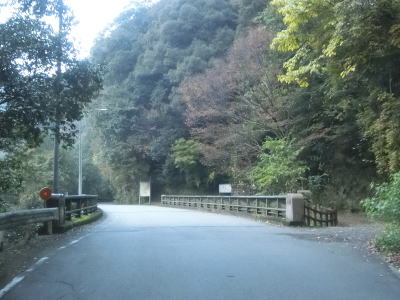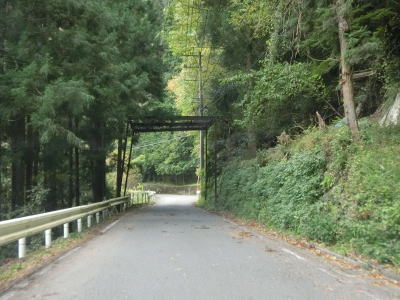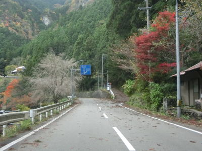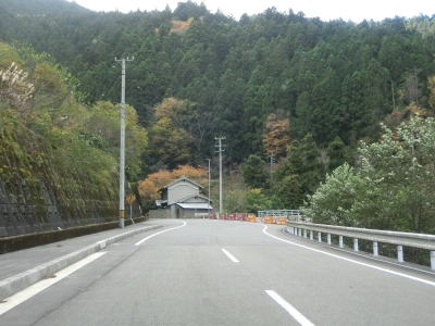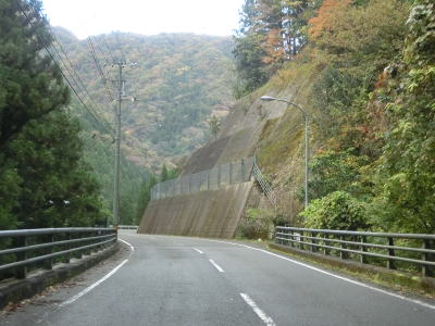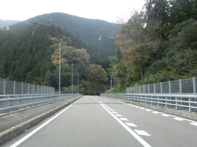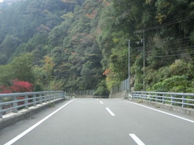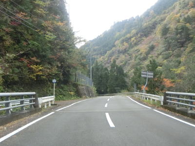 | 穴吹川の左岸を走っていると落下物用の柵の下を通る。道路の上空を横切っている物が何も確認できない事から木材搬出用のワイヤーなりがあったが既に撤去されたのだと思われる。センターライン付きの2車線道路を走っていると南張集落に至る市道との交差点を通過する。落ち葉等が堆積している市道だが、沿線にはそれなりの数の家屋が建っている。市道との交差点を過ぎてすぐに穴吹川を渡って右岸に移る。橋上だけは1.5車線と狭いが渡ってからは2車線道路である。 | ||