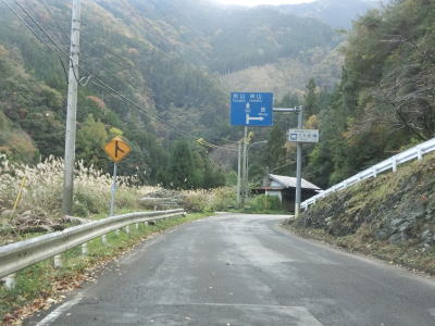 | 道幅が1.0車線になる所で2ヶ所目の対向車お知らせ区間が始まる。大佐古橋の手前でお知らせ区間が終わってセンターライン付きの大佐古橋を渡るが、その後すぐに1.5車線幅狭路になってしまう。穴吹川に沿った1.0〜1.5車線幅の狭路を走っていると旧木屋平村に入る。 | ||