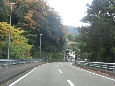 | 拝立谷橋の手前から道幅が広くなり橋を渡ってからはセンターライン付きの2車線道路になが、約600m先の閑定谷橋からは再び狭くなる。路肩が少し崩落した場所を通るが、その辺りは離合できない1.0車線幅となっている。1.0〜1.5車線幅の狭路を走っているとセンターライン付きの2車線道路になるが、これも長くは続かない。 | ||
