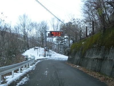 | 谷筋を走っていると対向車を知らせる電光掲示板が設置されている。距離は300m弱で、これまでの区間に比べて強烈に狭いという訳ではない。対向車お知らせ区間が終わると新しい舗装にセンターラインが引かれた道路になるが、300m程進むとセンターラインがなくなり1.8車線幅になる。その後再びセンターラインが現れるが200mも走らないうちに終わってしまう。 | ||