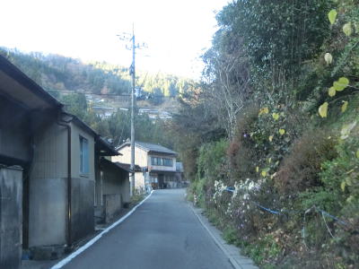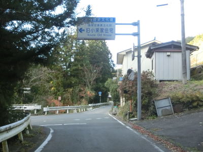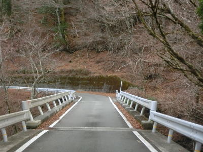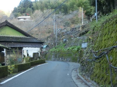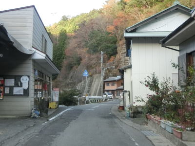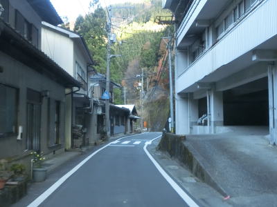 | 市道の知命橋の北詰を通過するが、以降は1.0〜1.5車線幅の狭路となる。さらに進むと2ヶ所目の対向車お知らせ区間が始まるが、今度は集落の中を通り抜けており沿線にいくつかの家屋がある。お知らせ区間が終わってからも1.0車線幅の狭路箇所が残っている。 | ||