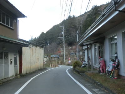 | 祖谷川沿いの名頃集落内の道幅は非常に狭く、横断歩道は3本だけで事足りる。乗用車同士あれば離合できなくはないが工事関係の大型ダンプと出くわした際は絶望するかもしれない。名頃集落内には多くのかかしが置かれているが、たまに人間と間違えてしまいそうになる。かかしであれば決して飛び出してはこないが、もしかしたら住民かもしれないと思わせる出来栄えである。 | ||