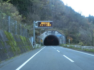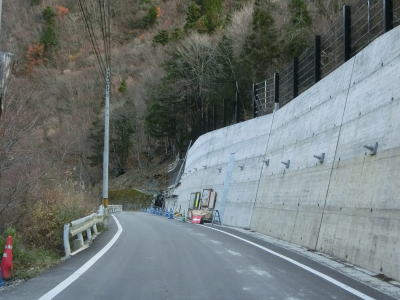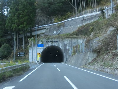 | 2車線道路を走っていると下瀬トンネルを通過する。2013年9月7日に供用が開始された比較的新しいトンネルである。トンネルを出て300m程進むとセンターラインがなくなり道幅も狭くなる。下瀬トンネルを含む落合バイパスとして拡幅工事が進められているものの、3号トンネル(仮称)は工事が始まっているかどうかも分からない様子だった(2号トンネル(仮称)は現道拡幅に変更された?)。 | ||