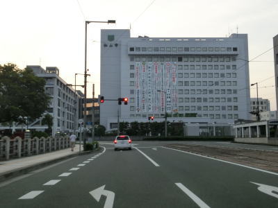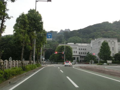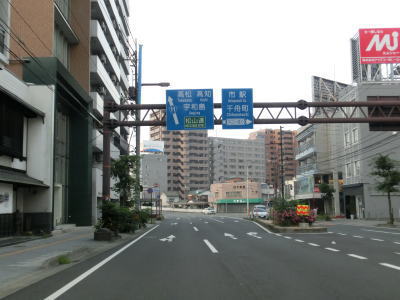 | 1.R11・R33・R56・R317・R379・R440松山市役所前交差点 | 2.愛媛県庁の前を右に直角にカーブ | 3.「高松158km 道後2km」 |