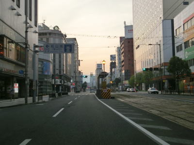 | 勝山交差点からは上下線の間にあった路面電車の代わりに街路樹のある中央分離帯になる。ビルが建ち並ぶ間を走っていると市道との永木交差点を左にカーブしながら通過して永木橋を渡る。永木橋の手前の永木町1交差点からは車線が増えて片側3車線になる。松山市街地方面に向かって走っている場合は永木交差点で左端車線が左折専用車線になってしまう。 | ||