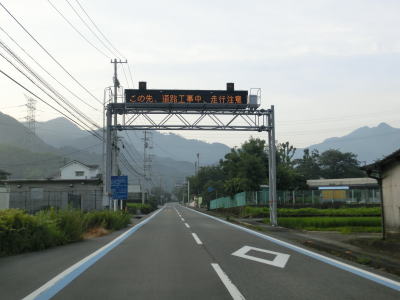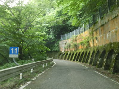 | R11から分岐すると対面2車線道路を内陸に向かって進む。沿線には家屋も多く道路状況も決して悪くないが、異常気象時通行規制区間の予告標識と電光掲示板を通過する。規制の基準は連続雨量30mm、時間雨量100m超である。予告標識以降も沿線の家屋は多く、緩やかな上り勾配の走りやすい道路状況が続いている。 | ||