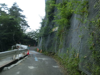 | 再びセンターラインが復活するが、落石対策工事のため片側交互通行規制が敷かれている。ただし、工事をしている気配は感じられず、崩落を放置しているように見えた。工事箇所の前後の舗装はきれいで比較的最近改良されたものと思われる。その後またセンターラインがなくなって1.5車線の狭路を走る。黒森峠まで9kmの番号4地点からはセンターライン付きの2車線道路となるがその距離も長くない。 | ||
