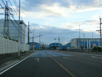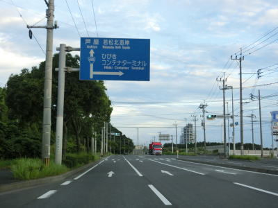 | 響川に沿った平坦な直線道路を走っていると左にカーブしながら茜橋を渡る。周辺には工場や倉庫の建設予定地と思われる空地が多くそのうちのいくつかは太陽光発電のパネルが設置されている。左カーブを曲がった後にひびきCT入口交差点を通過する。“CT”はコンテナターミナルの略と思われる。 | ||