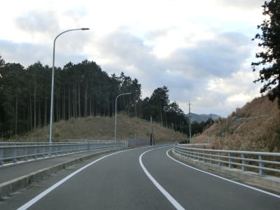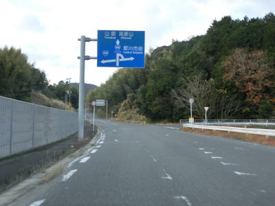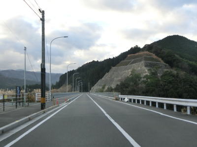 | 複数の橋梁を渡りながら2車線道路を南下していると現道の上を通過した後に現道との交差点を通過する。厳密に言えば現道とバイパスを繋ぐ連絡道路であり、旧道は伊良原ダム湖の下に沈んでいる。ダムの脇を通り過ぎるとダム湖畔を走る。釜の河内集落に至る町道との交差点の前には伊良原ダム見学台という展望所が設けられている。 | ||