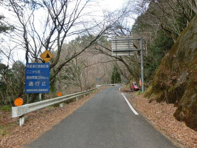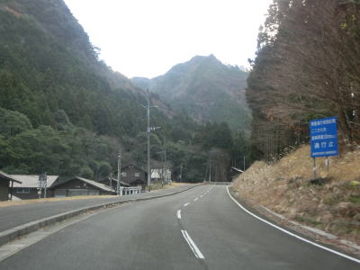 | 杉山橋の先の左カーブを曲がり終えるとセンターラインがなくなって1.5車線幅と狭くなる。直線道路を走っているとセンターラインが復活して2車線道路になると同時に上り勾配になる。蛇淵キャンプ場の前を通り過ぎると狭路に戻る。閉鎖ゲートは設置されていないが、蛇淵キャンプ場が福岡県側の最後の建物であり、以南は雨量通行規制区間である。連続雨量200mm超で通行止になるが、酷道区間のため基準値以下でも土砂崩れが発生したりして通行止になる可能性がある。 | ||