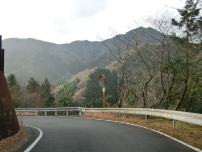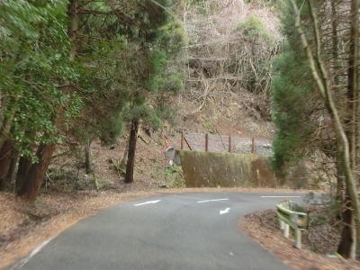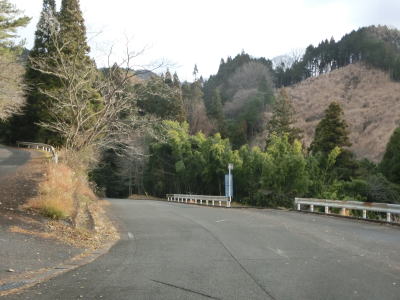 | 32番カーブ付近は山国川の谷筋の向こう側まで見渡せる場所を走る。ヘアピンカーブを含む急カーブのある下り勾配の狭路をひたすら走っていると雨量通行規制区間が終わる。市道が交差しており北上すると毛谷村六郎の墓がある。 | ||