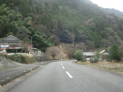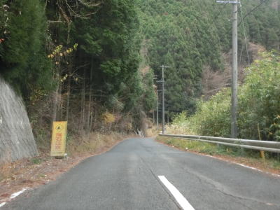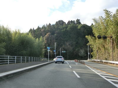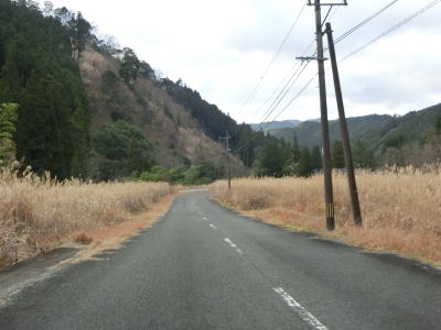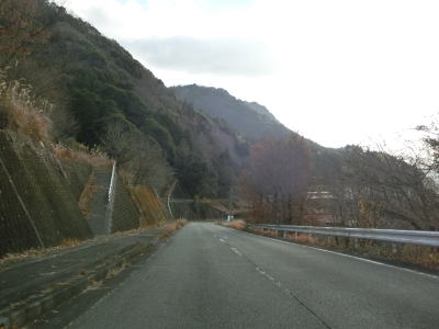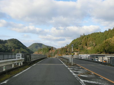 | 雨量通行規制区間が終わって少し走ると毛谷村神社の前を通り、その後センターライン付きの2車線道路となり出合橋を渡る。その後は緩やかな下り勾配の2車線快走路を走る。旧道と思われる川に沿った道路が確認できるが、枯草等に覆われており入口が封鎖されていなくても入ろうとは思わない状況である。ススキに覆われた場所を走るが、おそらく水田の跡と思われ、廃屋らしきものも見える。 | ||