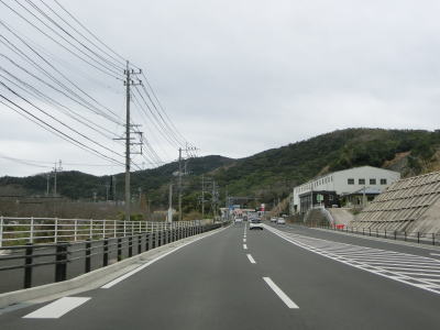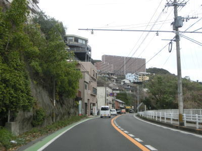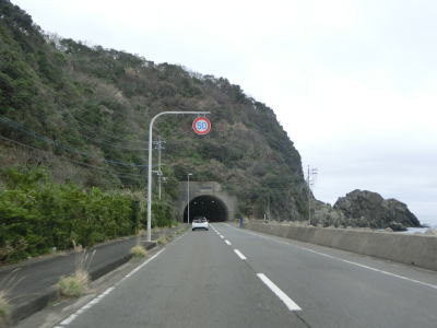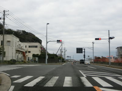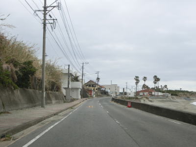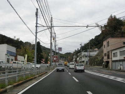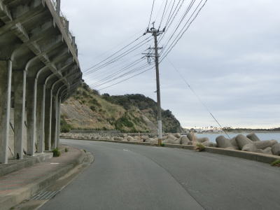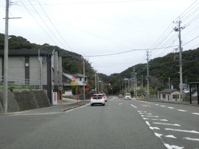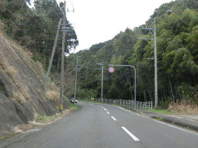| アップダウンとカーブの多い2車線道路で岳路集落を通り抜け、次の黒浜町集落では1.8車線幅だった道路の拡幅工事が行われていて歩道付きの2車線道路になりつつあった。黒浜町集落を過ぎると海岸線沿いとなって黒浜トンネルをくぐる。この辺りの沖に軍艦島として有名な端島がある。海岸線から離れて内陸に向かうと同時に上り勾配になった後に緩やかに下って行く。 | ||