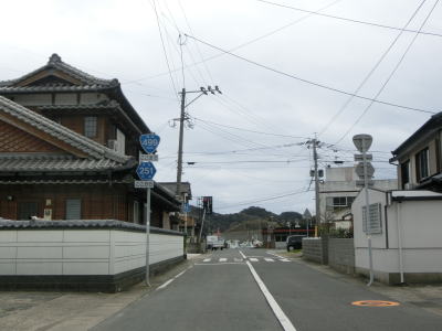 | 脇岬港と阿久根港間の直線距離は70km強だが、航路が設定されておらず陸路で迂回するしかない。R499を戻ってE34長崎道、E3九州道。E3A南九州西回り道の高速道路主体だと350kmあり、時間にして3時間弱要する。海路を含めると口之津港〜鬼池港と牛窓港〜蔵之元港の2つの航路を利用すると距離は200kmと短縮できるが、フェリーの時間に左右されてしまうため高速道路主体よりも時間がかかってしまう。今回は長崎市を先に走行し、熊本県某市に宿泊した翌日に阿久根市を走行している(R324の走行も絡めて)。 阿久根港の漁業関連の建物が並んでいる場所にR499の端点がある。信号機のない交差点からR499に進むと緩やかな勾配を上る。市道との交差点を通過した先でR3・鹿児島r362阿久根駅前交差点に至る。この交差点がR499の終点であり、鹿児島県内の延長は100mに満たない。そのため終点の交差点に案内標識は設置されていないが、ソトバやおにぎりがあるためR499が存在している事が確認できる。なおr362は阿久根駅停車場線といってR3と阿久根駅を結ぶロータリーであり、延長は50m程度である。 |